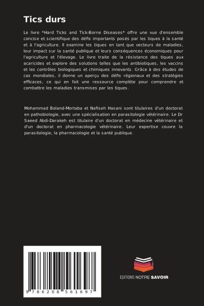 Le livre *Hard Ticks and Tick-Borne Diseases* offre une vue d'ensemble concise et scientifique des défis importants posés par les tiques à la santé et à l'agriculture. Il examine les tiques en tant que vecteurs de maladies, leur impact sur la santé publique et leurs conséquences économiques pour l'agriculture et l'élevage. Le livre traite de la résistance des tiques aux acaricides et explore des solutions telles que les antibiotiques, les vaccins et les contrôles biologiques et chimiques innovants. Grâce à des études de cas mondiales, il donne un aperçu des défis régionaux et des stratégies efficaces, ce qui en fait une ressource complète pour comprendre et combattre les maladies transmises par les tiques.