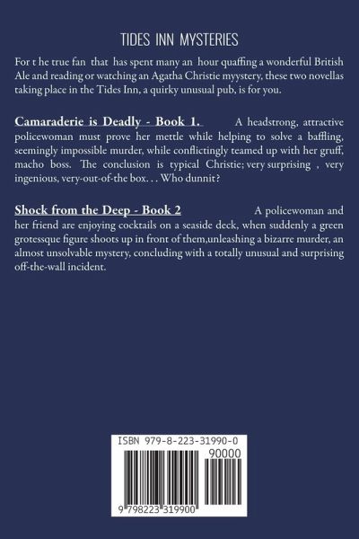 THE TIDES INN For the true fan that has spent many an hour quaffing a wonderful British Ale and reading or watching an Agatha Christie mystery, these two novellas are for you. The centerpiece, the 'Tides Inn Pub', is a quirky, personality plus, rustic, one-of-a-kind pub located on the rugged English Yorkshire coast, connected to the mainland by 100 feet of walkway that is occasionally flooded during high tide or extreme storms. CAMARADERIE IS DEADLY - Book 1 Headstrong, attractive, Constable Dawn Thompkins must prove her mettle while helping to solve a baffling, seemingly impossible murder, with many twists and turns, while conflictedly teamed up with gruff, macho Police Sergeant, Reggie Duke. The murder takes place while everyone is stranded in the pub by the tide. The story's conclusion is typical Christie; very surprising, very ingenious, very out-of-the-box. -- Who dunnit'?-- SHOCK FROM THE DEEP - Book 2 Two women are enjoying cocktails on a scenic, tranquil deck. Suddenly in a blink of the eye, we have a bizarre, murder - a quick, ingenious escape - a tangled baffling investigation - and a long list of colorful, eccentric suspects - culminating into an unforscene incident that provides a surprising off-the-wall incident finally bringing the investigation to a conclusion.