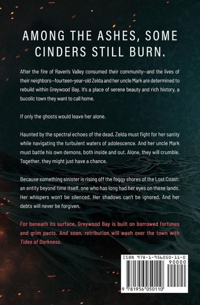 Among the ashes some cinders still burn. After the fire of Raven's Valley consumed their community-and the lives of their neighbors-fourteen-year-old Zelda and her uncle Mark are determined to rebuild within Greywood Bay. It's a place of serene beauty and rich history, a bucolic town they want to call home. If only the ghosts would leave her alone. Haunted by the spectral echoes of the dead, Zelda must fight for her sanity while navigating the turbulent waters of adolescence. And her uncle Mark must battle his own demons, both inside out. Alone, they will crumble. Together, they might just have a chance. Because something sinister is rising off the foggy shores of the Lost Coast: an entity beyond time itself, one who has long had her eyes on these lands. Her whispers won't be silenced. Her shadows can't be ignored. And her debts will never be forgiven. For beneath its surface Greywood Bay is built on borrowed fortunes and grim pacts. And soon retribution will wash over the town with Tides of Darkness.