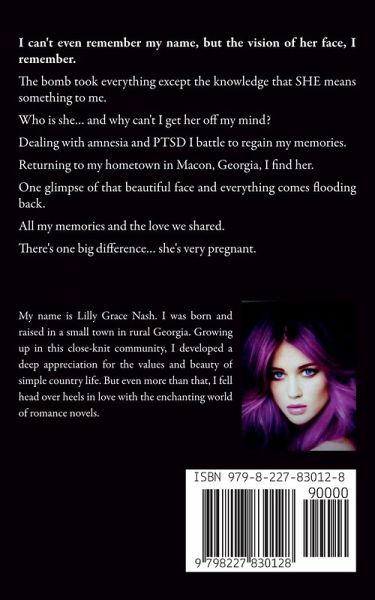 I can't even remember my name, but the vision of her face, I remember. The bomb took everything except the knowledge that SHE means something to me. Who is she... and why can't I get her off my mind? Dealing with amnesia and PTSD I battle to regain my memories. Returning to my hometown in Macon, Georgia, I find her. One glimpse of that beautiful face and everything comes flooding back. All my memories and the love we shared. There's one big difference... she's very pregnant.