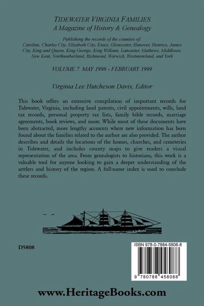 Tidewater Virginia Families: A Magazine of History and Genealogy focuses on Tidewater counties lying north of the James River, namely, Caroline, Charles City, Elizabeth City, Essex, Gloucester, Hanover, Henrico, James City, King and Queen, King George, King William, Lancaster, Mathews, Middlesex, New Kent, Northumberland, Richmond, Warwick, Westmoreland, and York. Each volume is perfect bound and contains complete name indexes to the contents of all four issues. The volumes contain a variety of records such as: Bible records, lists of marriages, abstracts of deeds and wills, military records, tax records and tithables, guardianship records, parish registers, tombstone inscriptions, and methodological essays germane to the Tidewater region, including tracing Virginia ancestors, county and parish formation, records pertaining to "burned counties," vital statistics, map collections, and places of note. This volume includes Walk the Land Your Ancestor Trod; More New Kent County Connections; Michael Talbot of Charles City County, Virginia; Civil Appointments, 1781-1798, King William County; Warwick County Court Records, 1683-1786; Legislative Petition of James Wright and His Wife Eve, York County, 1805; Henrico County Will Book 1, 1781-1787; Turner Family Bible, 1847-1875; King George County; Richard Dunn of King and Queen County, 1816; York Rendezvous; and Robert Armistead and Anne Smith Marriage Agreement, 1754; Rubble with a Cause, The Story of Menokin, Richmond County; More King and Queen County Connections (Land Patents Plotted); Civil Appointments, 1788-1792, James City County; Will of Thomas Edwards, 1857, Mathews County; Westmoreland County Land Tax Records, 1782; Armistead Family Bible, 1766-1849, Elizabeth City and York Counties; A List of Free Negroes and Mulattoes, 1833, King and Queen County; Will of William Langborn, 1821, King William County; An Archaeological Survey of a Golansville Cemetery; Golansville Society of Friends Meeting House Site, Reconnaissance-Level Archaeological Survey; Land Patents in St. Stephen's Parish, Part II; The Pollard Families of King William and King and Queen Counties; King George County Land Tax Records, 1787; The Will of William Langborn, 1821, King William County; Pay Roll of Persons at the State Magazine, 1788; Register of Free Blacks, 1810-1843; Essex County, Tidewater Folks, Lunenburg County, 1794-1816; To Be Sold: Land Tracts, 1788, Elizabeth City County; John Burruss, 1702, King William County; The Boswell-Hockaday Connection, James City and New Kent Counties; Will of William Gordon, 1720, Middlesex County; Untangling Some Obadiah and Luke Smiths, Henrico, Goochland and Halifax Counties; List of Clerks Fees, 1766, Northumberland County; Reward for Desertion, 1816, Hanover County; and more.
