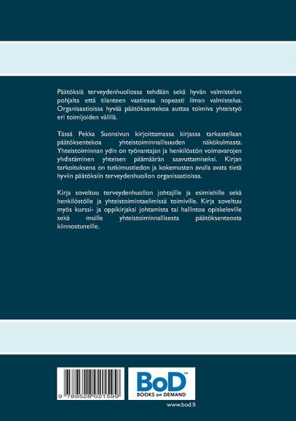 Päätöksiä terveydenhuollossa tehdään sekä hyvän valmistelun pohjalta että tilanteen vaatiessa nopeasti ilman valmistelua. Organisaatioissa hyvää päätöksentekoa auttaa toimiva yhteistyö eri toimijoiden välillä. Tässä Pekka Suonsivun kirjoittamassa kirjassa tarkastellaan päätöksentekoa yhteistoiminnallisuuden näkökulmasta. Yhteistoiminnan ydin on työnantajan ja henkilöstön voimavarojen yhdistäminen yhteisen päämäärän saavuttamiseksi. Kirjan tarkoituksena on tutkimustiedon ja kokemusten avulla avata tietä hyviin päätöksiin terveydenhuollon organisaatioissa. Kirja soveltuu terveydenhuollon johtajille ja esimiehille sekä henkilöstölle ja yhteistoimintaelimissä toimiville. Kirja soveltuu myös kurssi- ja oppikirjaksi johtamista tai hallintoa opiskeleville sekä muille yhteistoiminnallisesta päätöksenteosta kiinnostuneille.