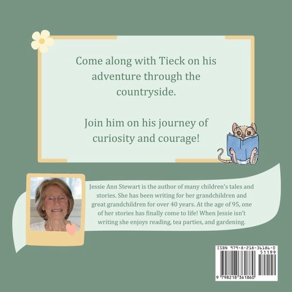 Enchanting Children's Book: "Tieck, a Mouse" * A heartwarming tale perfect for young readers, ages 5-8. Fulfilling a Grandmother's Dream: * Authored by Jessie Ann Stewart, and published at the age of 95. * A lifelong dream realized to see one of her stories come to life, making it a heartfelt and inspiring read. Inspired by Peter Rabbit: * Dive into a whimsical world inspired by fond memories of the beloved Peter Rabbit stories. * Features charming characters and gentle adventures in nature. Set in a Cozy Countryside: * Follow the shy yet curious mouse, Tieck, as he explores his vast, intriguing world. * Discover the magic of countryside adventures and animals. Ideal Baby Shower Gift: * The new craze is bringing an inscribed book instead of a card, "Tieck, a Mouse" features two full blank pages front and back to write an endearing message to the new baby that they can cherish for years. * A beautiful addition to any child's first library. * A timeless story that grows with your child, fostering a love for reading. Vibrant Illustrations: * Each page comes alive with colorful, engaging illustrations. * Captures the imagination and brings the story of Tieck and his friends to life. Educational and Fun: * Encourages early reading skills and imagination. * Teaches valuable life lessons about courage, curiosity, and the importance of home. Special Collector's Edition: * A 1st edition keepsake that can be cherished and passed down through generations.