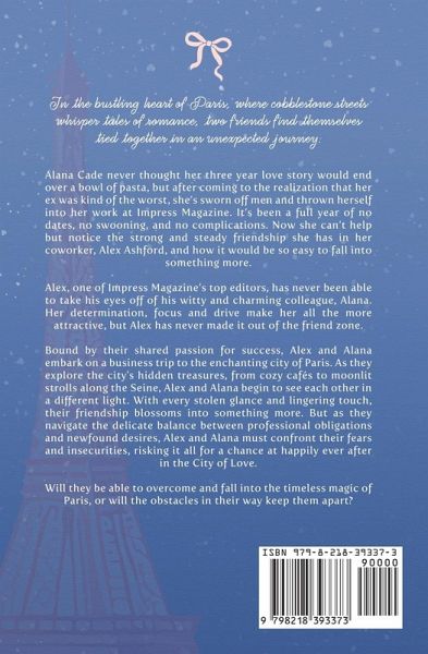 In the bustling heart of Paris, where cobblestone streets whisper tales of romance, two friends find themselves tied together in an unexpected journey. Alana Cade never thought her three year love story would end over a bowl of pasta, but after coming to the realization that her ex was kind of the worst, she's sworn off men and thrown herself into her work at Impress Magazine. It's been a full year of no dates, no swooning, and no complications. Now she can't help but notice the strong and steady friendship she has in her coworker, Alex Ashford, and how it would be so easy to fall into something more. ¿Alex, one of Impress Magazine's top editors, has never been able to take his eyes off of his witty and charming colleague, Alana. Her determination, focus and drive make her all the more attractive, but Alex has never made it out of the friend zone. Bound by their shared passion for success, Alex and Alana embark on a business trip to the enchanting city of Paris. As they explore the city's hidden treasures, from cozy cafés to moonlit strolls along the Seine, Alex and Alana begin to see each other in a different light. With every stolen glance and lingering touch, their friendship blossoms into something more. But as they navigate the delicate balance between professional obligations and newfound desires, Alex and Alana must confront their fears and insecurities, risking it all for a chance at happily ever after in the City of Love. Will they be able to overcome and fall into the timeless magic of Paris, or will the obstacles in their way keep them apart?