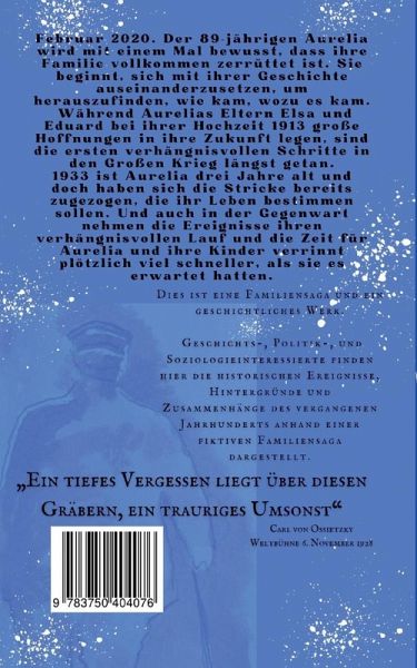 Februar 2020. Der 89-jährigen Aurelia wird mit einem Mal bewusst, dass ihre Familie vollkommen zerrüttet ist. So beginnt sie, sich mit ihrer Geschichte auseinanderzusetzen, um herauszufinden, wie kam, wozu es kam.Zur selben Zeit, als Aurelias Eltern Elsa und Eduard bei ihrer Hochzeit 1913 große Hoffnungen in ihr Leben setzen, werden die verhängnisvollen Schritte in den Großen Krieg gesetzt.1933 ist Aurelia drei Jahre alt und es haben sich längst die Stricke zugezogen, die ihr Leben bestimmen sollen, doch auch in der Ge-genwart nehmen die Ereignisse ihren verhängnisvollen Lauf und die Zeit für Aurelia und ihre Kinder verrinnt plötzlich viel schneller, als sie es erwartet hatten.Dies ist eine Familiensaga und ein geschichtliches Werk.Geschichts-, Politik-, und Soziologiebegeisterte finden hier in ansprechender und kurzweiliger Weise die historischen Ereignisse des vergangenen Jahrhunderts anhand einer fiktiven Familiensaga dargestellt und die Hintergründe und Zusammenhänge veranschaulicht. Zudem werden an vielen Stellen Bezüge zum aktuellen Zeitgeschehen hergestellt. Alle historischen Begebenheiten werden mittels zahlreicher Quellenangaben belegt.