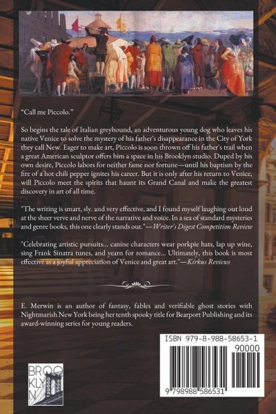 Have you ever loved a dog, a work of art, any part of Venice past, present or yet to be discovered? Call me Piccolo. So begins the tale of a young artist who just happens to be an Italian greyhound. In Piccolo's first artworld adventure, he leaves his native Venice to solve the mystery of his father's disappearance in the City of York they call New. Eager to make art, Piccolo is soon thrown off his father's trail when a great American sculptor offers him a space in his Brooklyn studio. Duped by his own desire, Piccolo labors for neither fame nor fortune--until his baptism by the fire of a hot chili pepper ignites his career. But it is only after his return to Venice will Piccolo meet the spirits that haunt its Grand Canal and make the greatest discovery in art of all time. The writing is smart, sly, and very effective, and I found myself laughing out loud at the sheer verve and nerve of the narrative and the voice. In a sea of standard mysteries and genre books, this one clearly stands out." —Writer's Digest Competition Review Celebrating artistic pursuits... with a clear sense of whimsy as canine characters enjoyably lap up wine, sing Frank Sinatra tunes, and yearn for romance. Along the way, the author also effectively skewers the modern-day art world—particularly its use of interns. Ultimately, this book is most effective as a joyful appreciation of Venice and great art.—Kirkus Reviews Skillfully the author weaves in artworld enticements and disappointments with such twists of humor and layers of insight that readers get a chance to feel what it might be like to crave success in that mad race to be part of the NYC art scene.—Arteidolia Amazon Verified Reader Reviews: ...The tone of the book charms from the get-go. The whimsical storyline takes you from Venice to Brooklyn and back on the tale of a canine character named Piccolo who's a chainsaw-wielding sculptor (it runs in his family). It's hilarious... Catherine A. Oden 2023 I absolutely loved the first-person narrative through the voice of our canine protagonist and could not put the book down, reading it well into the night! It touched on themes important to many of us: family, love, and belonging. Ava Richardson 2023 What a creative and wonderful story of an Italian greyhound named Piccolo Fortunato, who begins his life in Venice, travels to America on a grand adventure in search of his father, and returns to his home again, having learned much of the world and himself. Piccolo hails from a line of distinguished Italian greys, and he has much to live up to. As he embarks on his journey, he experiences hilarious encounters (such as discovering hot dogs). As Piccolo loves art, readers are also introduced to artwork in Venice and New York. The story is humorous, heartwarming, and heartbreaking at moments, and overall, highly entertaining. As the dog mom of two Italian greyhounds, I was really excited to read this and was not disappointed. I was immediately drawn to Piccolo, his feisty determination (true to Italian greyhounds in general), and all the interesting characters we meet along the way. Megan Lee 2023