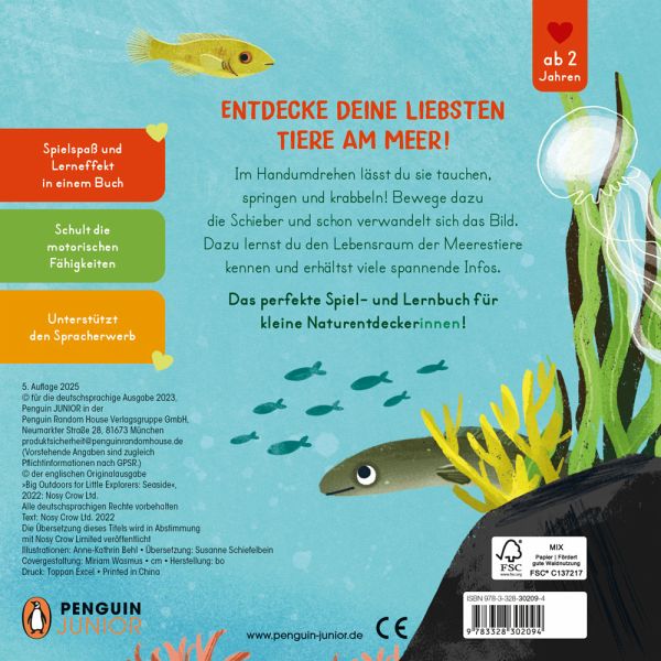 Schildkröten, Delfine, Krebse, oder Robben - im Meer ist einiges los! Mit nur einer Handbewegung kann das Kind die Tiere tauchen, springen und krabbeln lassen. So wird auf ganz spielerische Weise erstes Sachwissen über den Lebensraum »Meer« vermittelt. Und die vielfältigen Spieleffekte sorgen dafür, dass es nie langweilig wird!