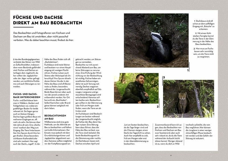 Daran schließen sich die Informationen zu den einzelnen Tierarten an. Zu jeder Tierart gehört fast immer mindestens eine Doppelseite. Auf dieser gibt es viele schöne Fotos sowie einen Steckbrief mit den verschiedenen Daten zur Tierart, Wissenswertes, Vorkommen, Verhalten, Jahreszeit und Tageszeit, Wetter sowie Beobachtung und Ausrüstung und teilweise auch „Mein Tipp“. Nicht enthalten sind hier Informationen zu den spezifischen Spuren des jeweiligen Tiers, wie Trittsiegel oder Kot. Diese mit anzugeben hätte vermutlich den Buchumfang gesprengt.