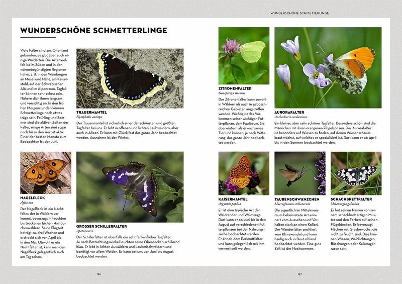 Auf der hinteren aufklappbaren Umschlagseite befindet sich der „Dating-Kalender, der aufzeigt, wann die im Buch enthaltenen Tiere am besten beobachtet werden können. Der Tabelle ist dabei nicht nur der Zeitraum im Jahresverlauf mit den besten Beobachtungschancen zu entnehmen, sondern auch die Angabe, ob das Tier dämmerungs-, tag- oder nachtaktiv ist.