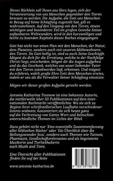 Dieses Büchlein soll Ihnen ans Herz legen, sich der Verantwortung von uns Menschen gegenüber den Tieren bewusst zu werden. Die Aufgabe, die Gott uns Menschen in Bezug auf Seine Schöpfung zugeteilt hat, gilt es wahrzunehmen. Auf den Umgang mit den Tieren, einem wichtigen und besonderen Teil im großen Gewebe Seines unfassbaren Weltwunders, wird in den kurzweiligen und leicht zu lesenden Kapiteln dieses Buches eingegangen. Gott hat nicht nur einen Plan mit den Menschen, der Natur, dem Planeten, sondern auch mit unseren Mitbewohnern, den Tieren. Da Gott heilig ist, sind es auch Seine Geschöpfe. Mögest du dich für die Errettung, welche in der Nachfolge Christi liegt, entscheiden. Mögen dir die Augen aufgehen und du das Geschenk, welches uns unser liebender Vater mit den Tieren zuteilwerden ließ, erkennen. Und mögest du erfahren, welch große Ehre Gott dem Menschen erwies, indem er uns als die Verwalter Seiner Schöpfung einsetzte. Mögen wir dieser großen Aufgabe gerecht werden. zur Autorin: www.antonia-katharina.de www.bolonka-zucht.de