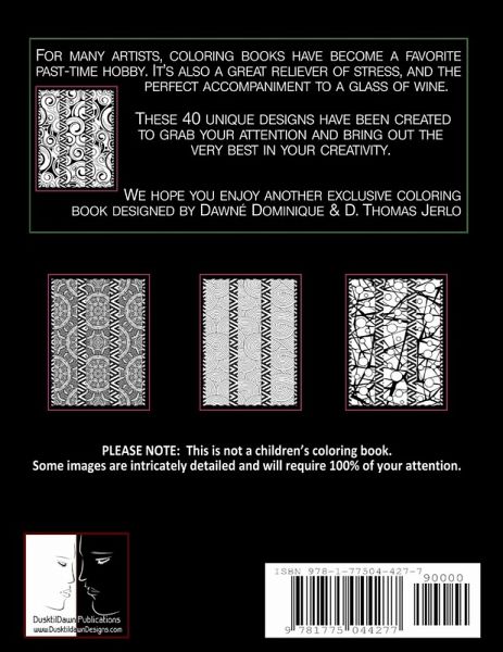 FOR MANY ARTISTS, COLORING BOOKS HAVE BECOME A FAVORITE PAST-TIME HOBBY. IT'S ALSO A GREAT RELIEVER OF STRESS. THESE 40 UNIQUE DESIGNS HAVE BEEN CREATED TO GRAB YOUR ATTENTION AND BRING OUT THE VERY BEST IN YOUR CREATIVITY. WE HOPE YOU ENJOY YET ANOTHER EXCLUSIVE COLORING BOOK DESIGNED BY DAWNÉ DOMINIQUE & D. THOMAS JERLO