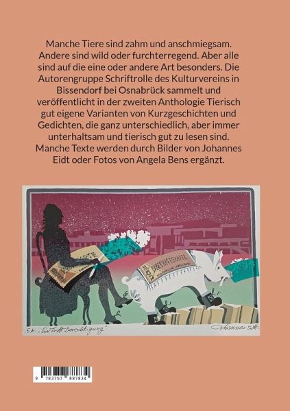 Manche Tiere sind zahm und anschmiegsam. Andere sind wild oder furchterregend. Aber alle sind auf die eine oder andere Art besonders. Die Autorengruppe Schriftrolle des Kulturvereins in Bissendorf bei Osnabrück sammelt und veröffentlicht in der zweiten Anthologie Tierisch gut eigene Varianten von Kurzgeschichten und Gedichten, die ganz unterschiedlich, aber immer unterhaltsam und tierisch gut zu lesem sind. Manche Texte werden durch Bilder von Johannes Eidt oder Fotos von Angela Bens ergänzt.