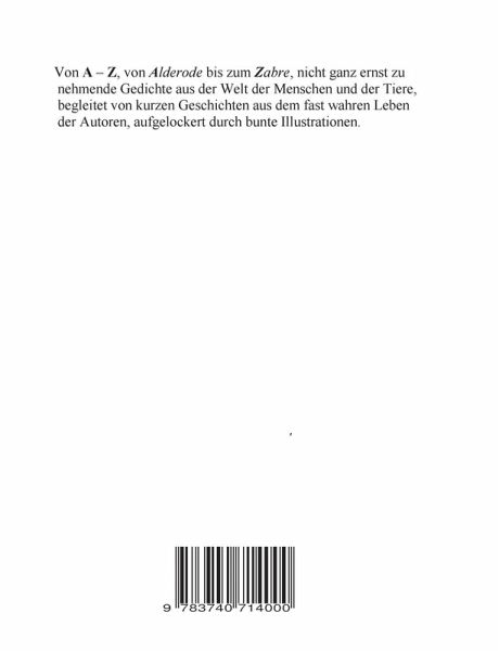 Von A - Z, von Alderode bis zum Zabre, nicht ganz ernst zu nehmende Gedichte, begleitet von kurzen Geschichten aus dem fast wahren Leben der Autoren, aufgelockert durch bunte Illustrationen.