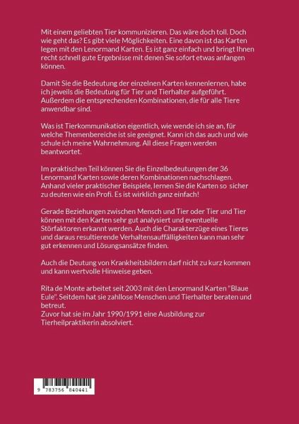 Mit einem geliebten Tier kommunizieren. Das wäre doch toll. Doch wie geht das? Es gibt viele Möglichkeiten. Eine davon ist das Karten legen mit den Lenormand Karten. Es ist ganz einfach und bringt Ihnen recht schnell gute Ergebnisse mit denen Sie sofort etwas anfangen können.Damit Sie die Bedeutung der einzelnen Karten kennenlernen, habe ich jeweils die Bedeutung für Tier und Tierhalter aufgeführt. Außerdem die entsprechenden Kombinationen, die für alle Tiere anwendbar sind.Was ist Tierkommunikation eigentlich, wie wende ich sie an, für welche Themenbereiche ist sie geeignet. Kann ich das auch und wie schule ich meine Wahrnehmung. All diese Fragen werden beantwortet.Im praktischen Teil können Sie die Einzelbedeutungen der 36 Lenormand Karten sowie deren Kombinationen nachschlagen. Anhand vieler praktischer Beispiele, lernen Sie die Karten so sicher zu deuten wie ein Profi. Es ist wirklich ganz einfach!Gerade Beziehungen zwischen Mensch und Tier oder Tier und Tier können mit den Karten sehr gut analysiert und eventuelle Störfaktoren erkannt werden. Auch die Charakterzüge eines Tieres und daraus resultierende Verhaltensauffälligkeiten kann man sehr gut erkennen und Lösungsansätze finden.Auch die Deutung von Krankheitsbildern darf nicht zu kurz kommen und kann wertvolle Hinweise geben. Rita de Monte arbeitet seit 2003 mit den Lenormand Karten "Blaue Eule". Seitdem hat sie zahllose Menschen und Tierhalter beraten und betreut. Zuvor hat sie im Jahr 1990/1991 eine Ausbildung zur Tierheilpraktikerin absolviert.