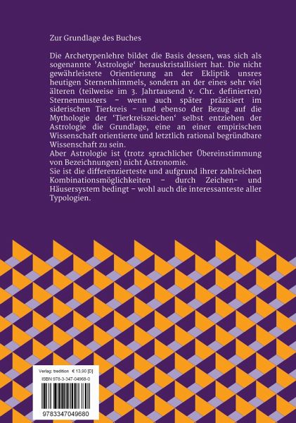 Zur Grundlage des BuchesDie Archetypenlehre bildet die Basis dessen, was sich als sogenannte 'Astrologie' herauskristallisiert hat. Die nicht gewährleistete Orientierung an der Ekliptik unsres heutigen Sternenhimmels, sondern an der eines sehr viel älteren (teilweise im 3. Jahrtausend v. Chr. definierten) Sternenmusters - wenn auch später präzisiert im siderischen Tierkreis - und ebenso der Bezug auf die Mythologie der 'Tierkreiszeichen' selbst entziehen der Astrologie die Grundlage, eine an einer empirischen Wissenschaft orientierte und letztlich rational begründbare Wissenschaft zu sein.Aber Astrologie ist (trotz sprachlicher Übereinstimmung von Bezeichnungen) nicht Astronomie. Sie ist die differenzierteste und aufgrund ihrer zahlreichen Kombinationsmöglichkeiten - durch Zeichen- und Häusersystem bedingt - wohl auch die interessanteste aller Typologien.