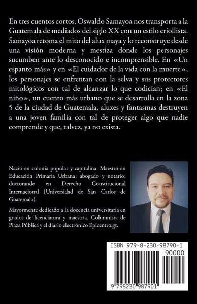 En tres cuentos cortos, Oswaldo Samayoa nos transporta a la Guatemala de mediados del siglo XX con un estilo criollista. Samayoa retoma el mito del alux maya y lo reconstruye desde una visión moderna y mestiza donde los personajes sucumben ante lo desconocido e incomprensible. En Un espanto más y en El cuidador de la vida con la muerte, los personajes se enfrentan con la selva y sus protectores mitológicos con tal de alcanzar lo que codician; en El niño, un cuento más urbano que se desarrolla en la zona 5 de la ciudad de Guatemala, aluxes y fantasmas destruyen a una joven familia con tal de proteger algo que nadie comprende y que, talvez, ya no exista.