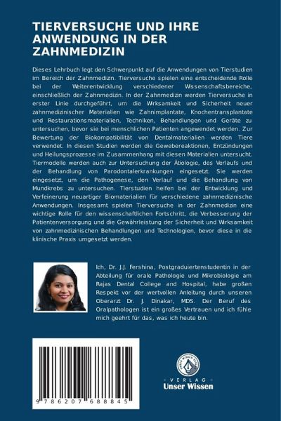 Dieses Lehrbuch legt den Schwerpunkt auf die Anwendungen von Tierstudien im Bereich der Zahnmedizin. Tierversuche spielen eine entscheidende Rolle bei der Weiterentwicklung verschiedener Wissenschaftsbereiche, einschließlich der Zahnmedizin. In der Zahnmedizin werden Tierversuche in erster Linie durchgeführt, um die Wirksamkeit und Sicherheit neuer zahnmedizinischer Materialien wie Zahnimplantate, Knochentransplantate und Restaurationsmaterialien, Techniken, Behandlungen und Geräte zu untersuchen, bevor sie bei menschlichen Patienten angewendet werden. Zur Bewertung der Biokompatibilität von Dentalmaterialien werden Tiere verwendet. In diesen Studien werden die Gewebereaktionen, Entzündungen und Heilungsprozesse im Zusammenhang mit diesen Materialien untersucht. Tiermodelle werden auch zur Untersuchung der Ätiologie, des Verlaufs und der Behandlung von Parodontalerkrankungen eingesetzt. Sie werden eingesetzt, um die Pathogenese, den Verlauf und die Behandlung von Mundkrebs zu untersuchen. Tierstudien helfen bei der Entwicklung und Verfeinerung neuartiger Biomaterialien für verschiedene zahnmedizinische Anwendungen. Insgesamt spielen Tierversuche in der Zahnmedizin eine wichtige Rolle für den wissenschaftlichen Fortschritt, die Verbesserung der Patientenversorgung und die Gewährleistung der Sicherheit und Wirksamkeit von zahnmedizinischen Behandlungen und Technologien, bevor diese in die klinische Praxis umgesetzt werden.