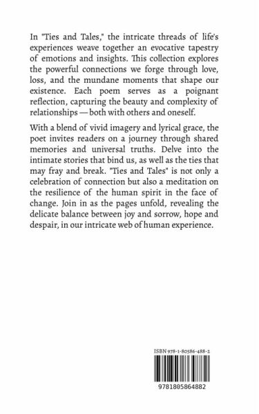 In "Ties and Tales," the intricate threads of life's experiences weave together an evocative tapestry of emotions and insights. This collection explores the powerful connections we forge through love, loss, and the mundane moments that shape our existence. Each poem serves as a poignant reflection, capturing the beauty and complexity of relationships - both with others and oneself. With a blend of vivid imagery and lyrical grace, the poet invites readers on a journey through shared memories and universal truths. Delve into the intimate stories that bind us, as well as the ties that may fray and break. "Ties and Tales" is not only a celebration of connection but also a meditation on the resilience of the human spirit in the face of change. Join in as the pages unfold, revealing the delicate balance between joy and sorrow, hope and despair, in our intricate web of human experience.