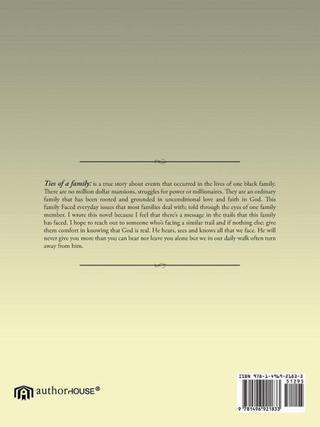 Ties of a family: is a true story about events that occurred in the lives of one black family. There are no million dollar mansions, struggles for power or millionaires. They are an ordinary family that has been rooted and grounded in unconditional love and faith in God. This family Faced everyday issues that most families deal with; told through the eyes of one family member. I wrote this novel because I feel that there?s a message in the trails that this family has faced. I hope to reach out to someone who?s facing a similar trail and if nothing else; give them comfort in knowing that God is real. He hears, sees and knows all that we face. He will never give you more than you can bear nor leave you alone but we in our daily walk often turn away from him.