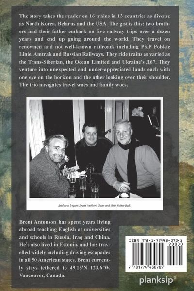 The author and his father and brother attempt the world's longest train ride, to see if they can stay together as a family unit in a tight train compartment for nine days. Not only did they survive without assaulting each other, but they also continued on epic train trips, the world's second and third-longest train trips in the world. Then they went to North Korea for a week, then lastly took a series of trains to get from Moscow to London whereupon they circumnavigated the northern hemisphere by train, together, with the same love, respect, and closeness then they started out with. It's an engaging, danger-filled, comedic, and "off the rails" kind of book. You're sure to enjoy it! As a traveler and teacher, Brent Antonson has spent years living abroad for extended stints teaching English at universities and schools in Russia and Iraq and China. He's also lived in Estonia, and has travelled widely including driving escapades in all 50 American states. His first book Of Russia; A Year Inside was self-published in 2008. He's written lyrics to several songs that have been recorded. Brent currently stays tethered to 49.15'N 123.6'W, Vancouver, Canada.