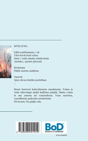 Käsissäsi on harvinainen runoteos. Sen sisältö on koottu Tie pitäjä vala FB-sivustoon kirjoitetusta rujoudesta. Lähes aina Olvi muusana ja metallimusiikki taustalla. Runoja poimitaan polkujen varrelta. Jos tarvitset parannusta ja vilvoitusta, kerää sulosäkeitä tutuilta ja kauniilta järvenrantareiteiltä. Runoihin tarttuu aamuisia auringonsäteitä. Jos olet jo vahva ja voimakas, polkusi on tuntematon. Lähde matkaan varjojen herättyä näkymättömiin. Polkusi kiemurtelee synkkään viitaan. Kaikki mitä kohtaat, on uutta. Löydät aarteita tai aarteiksi naamioitunutta tuhoa. Kalevalan laulumailla, kaikkia runoja ei ole vielä veisattu. Vahvuuttasi tai voimakkuuttasi ei mitata miekan painolla. Vaan Sanojen mahdilla. Valitse polkusi!