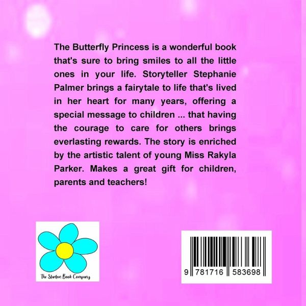 The Butterfly Princess is a wonderful book that's sure to bring smiles to all the little ones in your life. Storyteller Stephanie Palmer brings a fairytale to life that's lived in her heart for many years, offering a special message to children ... that having the courage to care for others brings everlasting rewards. The story is enriched by the artistic talent of young Miss Rakyla Parker. Makes a great gift for children, parents and teachers!