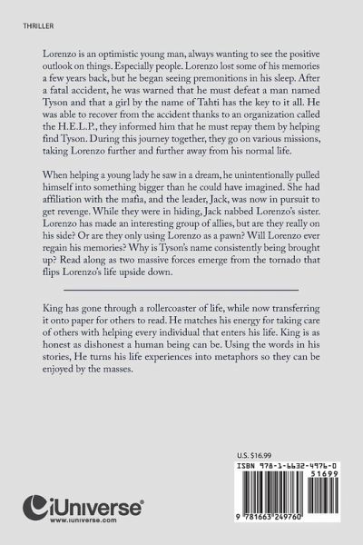 Lorenzo is an optimistic young man, always wanting to see the positive outlook on things. Especially people. Lorenzo lost some of his memories a few years back, but he began seeing premonitions in his sleep. After a fatal accident, he was warned that he must defeat a man named Tyson and that a girl by the name of Tahti has the key to it all. He was able to recover from the accident thanks to an organization called the H.E.L.P., they informed him that he must repay them by helping find Tyson. During this journey together, they go on various missions, taking Lorenzo further and further away from his normal life. When helping a young lady he saw in a dream, he unintentionally pulled himself into something bigger than he could have imagined. She had affiliation with the mafia, and the leader, Jack, was now in pursuit to get revenge. While they were in hiding, Jack nabbed Lorenzo's sister. Lorenzo has made an interesting group of allies, but are they really on his side? Or are they only using Lorenzo as a pawn? Will Lorenzo ever regain his memories? Why is Tyson's name consistently being brought up? Read along as two massive forces emerge from the tornado that flips Lorenzo's life upside down.