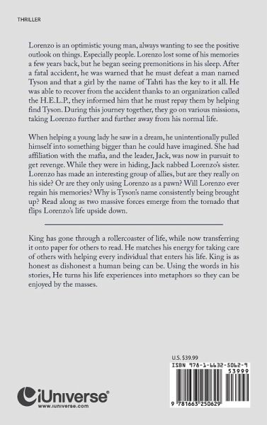 Lorenzo is an optimistic young man, always wanting to see the positive outlook on things. Especially people. Lorenzo lost some of his memories a few years back, but he began seeing premonitions in his sleep. After a fatal accident, he was warned that he must defeat a man named Tyson and that a girl by the name of Tahti has the key to it all. He was able to recover from the accident thanks to an organization called the H.E.L.P., they informed him that he must repay them by helping find Tyson. During this journey together, they go on various missions, taking Lorenzo further and further away from his normal life. When helping a young lady he saw in a dream, he unintentionally pulled himself into something bigger than he could have imagined. She had affiliation with the mafia, and the leader, Jack, was now in pursuit to get revenge. While they were in hiding, Jack nabbed Lorenzo's sister. Lorenzo has made an interesting group of allies, but are they really on his side? Or are they only using Lorenzo as a pawn? Will Lorenzo ever regain his memories? Why is Tyson's name consistently being brought up? Read along as two massive forces emerge from the tornado that flips Lorenzo's life upside down.