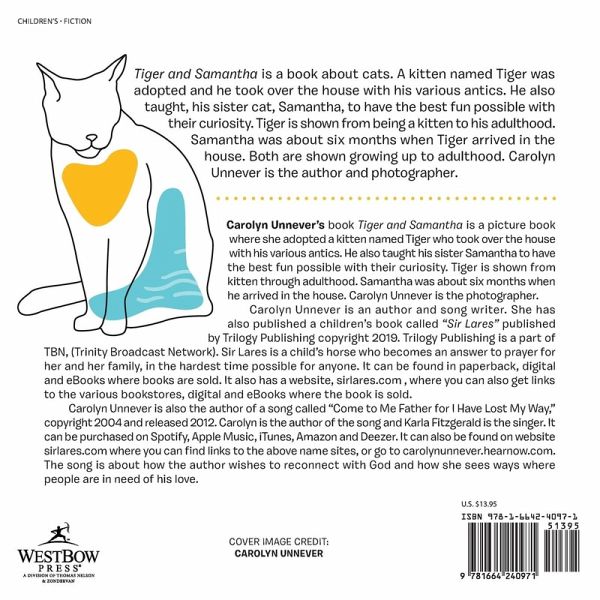 Carolyn Unnever's book Tiger and Samantha is a picture book where she adopted a kitten named Tiger who took over the house with his various antics. He also taught his sister Samantha to have the best fun possible with their curiosity. Tiger is shown from kitten through adulthood. Samantha was about six months when he arrived in the house. Carolyn Unnever is the photographer. Carolyn Unnever is an author and song writer. She has also published a children's book called "Sir Lares" published by Trilogy Publishing copyright 2019. Trilogy Publishing is a part of TBN, (Trinity Broadcast Network). Sir Lares is a child's horse who becomes an answer to prayer for her and her family, in the hardest time possible for anyone. It can be found in paperback, digital and eBooks where books are sold. It also has a website, sirlares.com , where you can also get links to the various bookstores, digital and eBooks where the book is sold. Carolyn Unnever is also the author of a song called "Come to Me Father for I Have Lost My Way," copyright 2004 and released 2012. Carolyn is the author of the song and Karla Fitzgerald is the singer. It can be purchased on Spotify, Apple Music, iTunes, Amazon and Deezer. It can also be found on website sirlares.com where you can find links to the above name sites, or go to carolynunnever.hearnow.com. The song is about how the author wishes to reconnect with God and how she sees ways where people are in need of his love.
