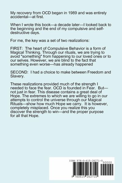 My recovery from OCD began in 1989 and was entirely accidental-at first. When I wrote this book-a decade later-I looked back to the beginning and the end of my compulsive and self-destructive days. For me, the heart of Compulsive Behavior is a form of Magical Thinking. Through our rituals, we are trying to avoid "something" from happening to our loved ones or to our selves. However, we are blind to the fact that something even worse-has already happened. I realized that I had a choice to make between Freedom and Slavery. These realizations provided much of the strength I needed to face the fear. OCD is founded in Fear. But-not just in fear. This disease contains a great deal of Hope. The extremes to which we are willing to go in our attempts to control the universe through our Magical Rituals-show how much Hope we carry. It is however, completely misplaced. Once you realize this you discover the strength to win-and the proper purpose for all that Hope.