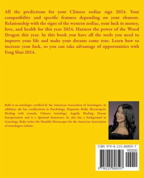 All the predictions for your Chinese zodiac sign 2024. Your compatibility and specific features depending on your element. Relationship with the signs of the western zodiac, your luck in money, love, and health for this year 2024. Harness the power of the Wood Dragon this year. In this book you have all the tools you need to improve your life and make your dreams come true. Learn how to increase your luck, so you can take advantage of opportunities with Feng Shui 2024.