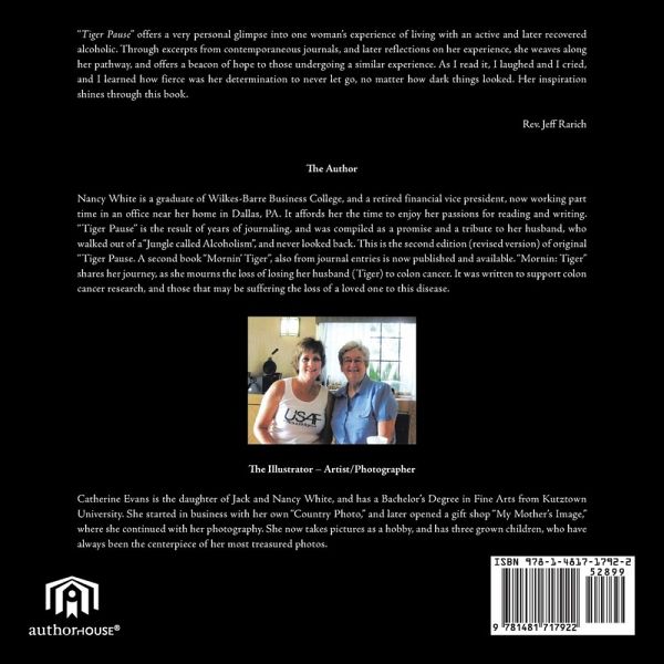 "Tiger Pause" offers a very personal glimpse into one woman's experience of living with an active and later recovered alcoholic. Through excerpts from contemporaneous journals, and later reflections on her experience, she weaves along her pathway, and offers a beacon of hope to those undergoing a similar experience. As I read it, I laughed and I cried, and I learned how fierce was her determination to never let go, no matter how dark things looked. Her inspiration shines through this book. Rev. Jeff Rarich