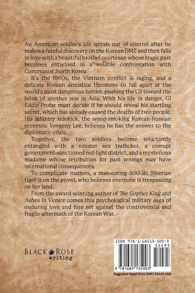 "The dawn still comes even if the rooster dies." "A haunting, nerve-wracking tale set in the eerie landscape of the Korean demilitarized zone (DMZ)." -BestThrillers An American soldier's life spirals out of control after he makes a fateful discovery on the Korean DMZ and then falls in love with a beautiful brothel courtesan whose tragic past becomes entwined in a volatile confrontation with Communist North Korea. It's the 1960s, the Vietnam conflict is raging, and a delicate Korean armistice threatens to fall apart at the world's most dangerous border, pushing the US toward the brink of another war in Asia. With his life in danger, GI Eddie Profar must decide if he should reveal his startling secret, which has already caused the deaths of two people. His infantry sidekick, the weed-smoking Korean-Russian eccentric Yevgeny Lee, believes he has the answer to the diplomatic crisis. Together, the two soldiers become reluctantly entangled with a sinister sex trafficker, a corrupt government-sanctioned red-light district, and a mysterious madame whose retribution for past wrongs may have international consequences. To complicate matters, a man-eating 500 lb. Siberian tiger is on the prowl, who believes everyone is trespassing on her land. From the award-winning author of The Gopher King and Ashes in Venice comes this psychological military saga of enduring love and fate set against the controversial and fragile aftermath of the Korean War.