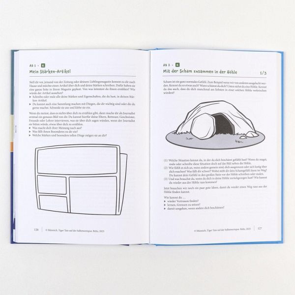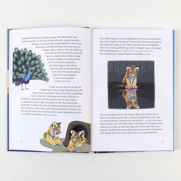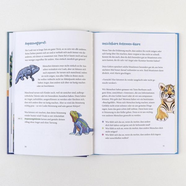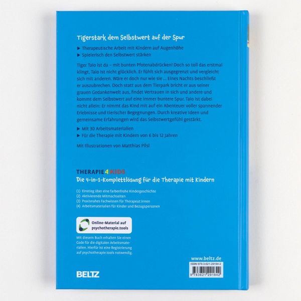 Tigerstark dem Selbstwert auf der Spur-Therapeutische Arbeit mit Kindern auf Augenhöhe-Kindgerechter Einstieg in die Selbstwert-Stärkung-Den Selbstwert bei Herausforderungen stärken: Anderssein und InklusionTiger Taio ist da - und zwar mit bunten Pfotenspuren! Das hört sich lebendig und glücklich an? Ist es aber zu Beginn ganz und gar nicht. Denn Taio ist mies drauf. Er zieht sich zurück und dunkle Gedanken füllen seinen Kopf. Könnte er doch nur sein wie die anderen ... Eines nachts reicht es ihm und er beschließt, auszubrechen. Doch statt aus dem Tierpark bricht er aus seiner grauen Gedankenwelt aus, findet Vertrauen in sich und andere und kommt seinem eigenen Selbstwert auf eine immer buntere Spur. Den eigenen Wert spüren und kindgerecht stärkenDer Selbstwert spielt bei der mentalen Gesundheit eine entscheidende Rolle. Durch seine Stärkung werden Symptome nachhaltig verbessert und Stabilität erreicht. Das Abenteuer mit wundersam tierischen Begegnungen bietet einen niedrigschwelligen Einstieg in die Selbstwertarbeit. -Mit 30 Arbeitsmaterialien -Für die Therapie mit Kindern von 6 bis 12 JahrenDie Reihe Therapie4Kids wird herausgegeben von Melanie Gräßer.