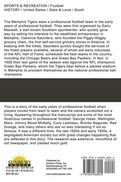 The Memphis Tigers were a professional football team in the early years of professional football. They were first organized by Early Maxwell, a well known Southern sportswriter, who quickly gave way by selling his interests to the wealthiest entrepreneur in Memphis, Clarence Saunders, who founded the Piggly-Wiggly grocery chain, the first self-service grocery stores in America. In keeping with the times, Saunders quickly bought the services of the finest players available, several of whom are early inductees of the NFL Hall of Fame, scheduled the best teams in the country, including the Chicago Bears and Green Bay Packers. In fact, in 1929 their last game of the season was against the NFL champions Green Bay Packers, whom the Tigers beat before a packed stadium in Memphis to proclaim themselves as the national professional ball champions. This is a story of the early years of professional football when players moved from team to team and the owners scratched out a living. Appearing throughout the manuscript are some of the most illustrious names in professional football: George Halas, Wellington Mara, Johnny Blood McNally, Curly Lambeau, Bronko Nagurski, Red Grange, and many others who are no less interesting if not so famous. It was a different time, the late 1920s and early 1930s, a segregated American society but with great changes happening that are reflected in this story. The research was extensive, microfilms of old newspaper, and yielded much gold.