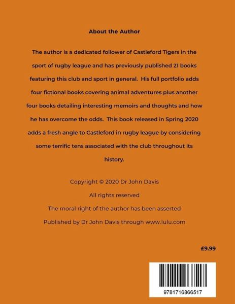 The author is a dedicated follower of Castleford Tigers in the sport of rugby league and has previously published 21 books featuring this club and sport in general. His full portfolio adds four fictional books covering animal adventures plus another four books detailing interesting memoirs and thoughts and how he has overcome the odds. This book released in Spring 2020 adds a fresh angle to Castleford in rugby league by considering some terrific tens associated with the club throughout its history.