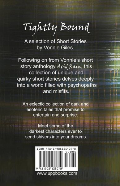 A selection of Short Stories by Vonnie Giles. Following Vonnie's successful short story compilation Acid Rain and her contributions to the short story anthology 'Picked and Mixed', Vonnie has collected together another selection of her unique and quirky tales. Tightly Bound delves into her eclectic collection of dark and esoteric tales and promises to entertain and surprise. Meet more of the darkest characters ever to send shivers into your dreams.