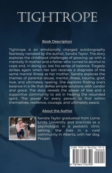 Tightrope is an emotionally charged autobiography fearlessly narrated by the author. Sandra explores the themes of parental abuse, mental illness, trauma, grief, love, and ultimately the process of healing with candor and the kind of self-assurance that comes from lived experience. She explores the process of finding one's balance in life. The story reveals the complexity of relationships in a dysfunctional family and the wounded spirit of those with mental illness. Her story speaks to the power of every person to find within themselves resilience, courage, and faith despite life's challenges. Small photo on the back cover: Sandra Taylor is a clinical psychologist who lives in Alberta, Canada with her dog.