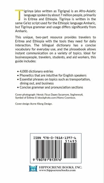 This combination Tigrinya phrasebook and two-way Tigrinya-English dictionary is an essential reference while traveling in Eritrea and Ethiopia. The Hippocrene Dictionary & Phrasebook series allows people be travelers, not tourists, by connecting with the local culture and people in their native language.