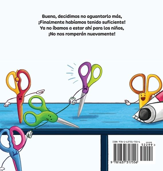 Enseña bondad y respeto por las personas y las cosas. Un libro hilarante, que rima y se lee en voz alta, perfecto para el primer día de clases o cualquier otro día. ¡Las tijeras del aula ya han tenido suficiente! Primero nos agarran mal. Caminan con nuestras puntas hacia afuera, Que es la forma más fácil de hacerse daño. ¡no debe hacerse de ninguna manera!