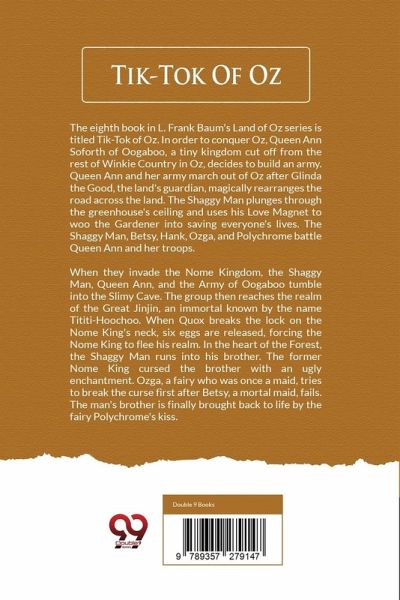 The eighth book in L. Frank Baum's Land of Oz series is titled Tik-Tok of Oz. In order to conquer Oz, Queen Ann Soforth of Oogaboo, a tiny kingdom cut off from the rest of Winkie Country in Oz, decides to build an army. Queen Ann and her army march out of Oz after Glinda the Good, the land's guardian, magically rearranges the road across the land. The Shaggy Man plunges through the greenhouse's ceiling and uses his Love Magnet to woo the Gardener into saving everyone's lives. The Shaggy Man, Betsy, Hank, Ozga, and Polychrome battle Queen Ann and her troops. When they invade the Nome Kingdom, the Shaggy Man, Queen Ann, and the Army of Oogaboo tumble into the Slimy Cave. The group then reaches the realm of the Great Jinjin, an immortal known by the name Tititi-Hoochoo. When Quox breaks the lock on the Nome King's neck, six eggs are released, forcing the Nome King to flee his realm. In the heart of the Forest, the Shaggy Man runs into his brother. The former Nome King cursed the brother with an ugly enchantment. Ozga, a fairy who was once a maid, tries to break the curse first after Betsy, a mortal maid, fails. The man's brother is finally brought back to life by the fairy Polychrome's kiss.