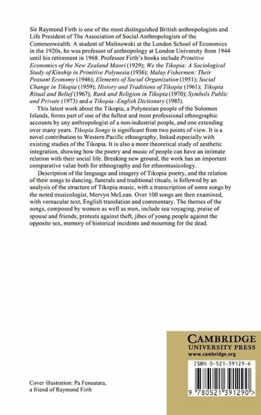 Sir Raymond Firth is the most distinguished living British anthropologist, and one internationally acclaimed. His latest work forms part of one of the fullest and most professional ethnographic accounts by any anthropologist of a non-industrial people, an account which extends over many years. This book is about the songs of a Western Pacific people, the Tikopia, who until recently lived entirely on a small remote island of the Solomons. Their songs vary from lively dance chants to mournful funeral laments. All are novel to western ears. The book provides about 100 examples, in text and translation. It also discusses the relation of the songs to the social life of the people, and it includes an analysis of the structure of their music, by Mervyn McLean, a noted musicologist. A cassette published at the same time reproduces about 30 of the songs which appear in the book.