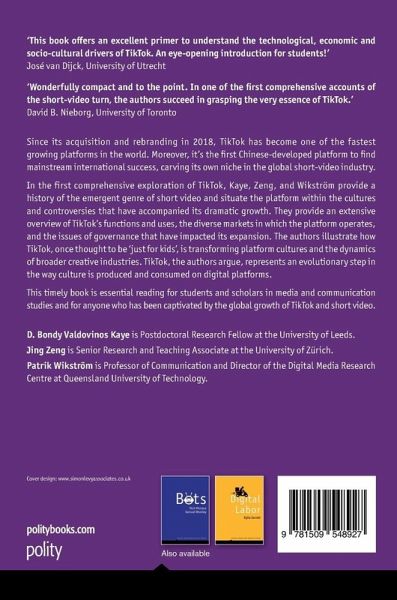 In the first comprehensive exploration of TikTok, Kaye, Zeng, and Wikström provide a history of the emergent genre of short video and situate the platform within the cultures and controversies that have accompanied its dramatic growth. They provide an extensive overview of TikTok's functions and uses, the diverse markets in which the platform operates, and the issues of governance that have impacted its expansion. Once thought to be 'just for kids', the authors illustrate how TikTok is further transforming platform cultures and the dynamics of broader creative industries. TikTok, the authors argue, represents an evolutionary step in the way culture is produced and consumed on digital platforms.