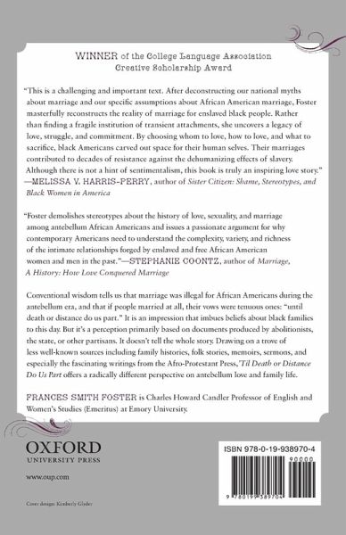 Conventional wisdom tells us that marriage was illegal for African Americans during the antebellum era, and that if people married at all, their vows were tenuous ones: "until death or distance do us part." It is an impression that imbues beliefs about black families to this day. But it's a perception primarily based on documents produced by abolitionists, the state, or other partisans. It doesn't tell the whole story. Drawing on a trove of less well-known sources including family histories, folk stories, memoirs, sermons, and especially the fascinating writings from the Afro-Protestant Press,'Til Death or Distance Do Us Part offers a radically different perspective on antebellum love and family life. Frances Smith Foster applies the knowledge she's developed over a lifetime of reading and thinking. Advocating both the potency of skepticism and the importance of story-telling, her book shows the way toward a more genuine, more affirmative understanding of African American romance, both then and now.