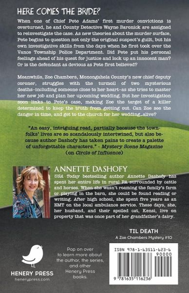 When one of Chief Pete Adams' first murder convictions is overturned, he and County Detective Wayne Baronick are assigned to reinvestigate the case. As new theories about the murder surface, Pete begins to question not only the original suspect's guilt, but his own investigative skills from the days when he first took over the Vance Township Police Department. Did Pete put his personal feelings ahead of his quest for justice and lock up an innocent man? Or is the defendant as devious as Pete first believed? Meanwhile, Zoe Chambers, Monongahela County's new chief deputy coroner, struggles with the turmoil of two mysterious deaths-including someone close to her heart-as she tries to master her new job and plan her upcoming wedding. But her investigation soon links to Pete's case, making Zoe the target of a killer determined to keep the truth from getting out. Can Zoe see the danger in time, and get to the church for her wedding…alive? - - - - - - - - - - - - - TIL DEATH by Annette Dashofy A Henery Press Mystery. If you like one, you'll probably like them all.