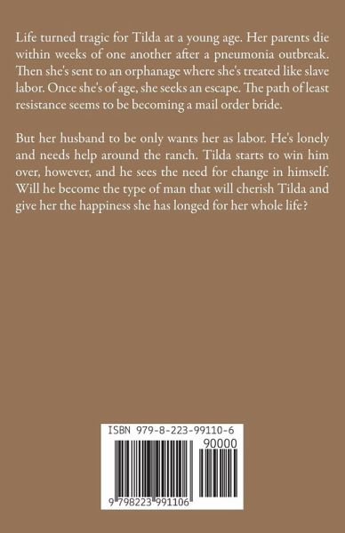 Life turned tragic for Tilda at a young age. Her parents die within weeks of one another after a pneumonia outbreak. Then she's sent to an orphanage where she's treated like slave labor. Once she's of age, she seeks an escape. The path of least resistance seems to be becoming a mail order bride. But her husband to be only wants her as labor. He's lonely and needs help around the ranch. Tilda starts to win him over, however, and he sees the need for change in himself. Will he become the type of man that will cherish Tilda and give her the happiness she has longed for her whole life?
