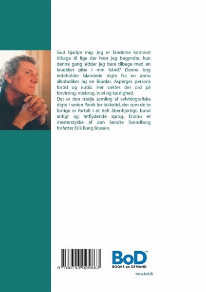 Gud hjælpe mig. Jeg er fandeme kommet tilbage til lige der hvor jeg begyndte, kun denne gang sidder jeg bare tilbage med en knækket pibe i min hånd? Denne bog indeholder blandede digte fra en ædru alkoholiker og en Bipolar, Asperger persons fortid og nutid. Her sættes der ord på forvirring, misbrug, tvivl og kærlighed. Det er den tredje samling af selvbiografiske digte i serien Panik før lukketid, der som de to forrige er fortalt i et helt åbenhjertigt, bund ærligt og letflydende sprog. Endnu et mesterstykke af den kendte Svendborg forfatter Erik Bang Boesen.