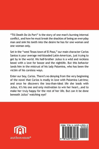"Till Death Do Us Part" is the story of one man's burning internal conflict, and how he must break the shackles of being an everyday man and sink his teeth into the desire he has for one woman and one woman only. Set in the "west Texas town of El Paso," our main character Carlos Santos is your average red-blooded Latin-American, just trying to get by in the world. His half-brother Julius is a wild and reckless beast with a love for booze and the nightlife. But this behavior lands him in the mistrust of his lady Palomina, who has been the victim of his careless ways. Enter our boy, Carlos. There's no denying from the very beginning of the novel that Carlos is madly in love with Palomina Latrima; and once he discovers the less-than-ideal life she leads with Julius, it's his one and only motivation to win her heart...and to make her truly happy for the rest of her life. But can it be done beneath Julius' watching eye?