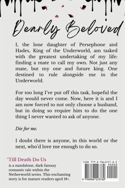 I, Desephone, the lone daughter of Persephone and Hades, King of the Underworld, am tasked with the greatest undertaking of my life: finding a mate to call my own. Not just any mate, but one destined to rule alongside me in the underworld. My once and future king. For too long I've put off this task, hopeful the day would never come. Now here it is and I am forced to not only choose a husband, but in doing so require him to do the one thing I never wanted to ask of anyone. To die for me. 'Till Death Do Us is a standalone paranormal romance within both the Beautiful Nightmare and Netherworld universes. This is perfect for new and returning readers of this combined universe. Meet new characters, learn new secrets, all while plunging heart-first into a sweet and steamy, friends-to-lovers tale full of darkly ringing wedding bells. Content Notice: For mature adults aged 18+. Contains steamy, sexual situations, profanity, violence, misogyny, and other themes.