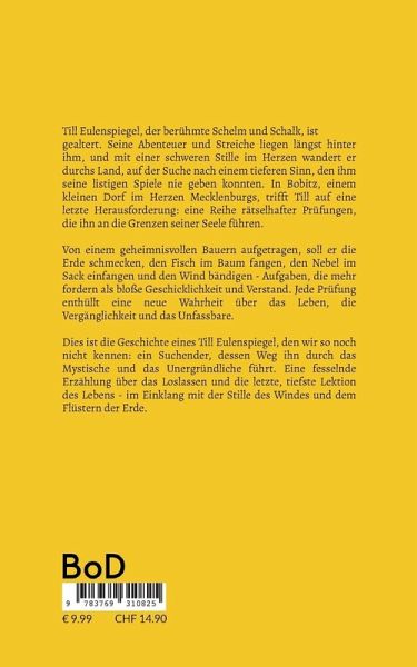 Till Eulenspiegel, der berühmte Schelm und Schalk, ist gealtert. Seine Abenteuer und Streiche liegen längst hinter ihm, und mit einer schweren Stille im Herzen wandert er durchs Land, auf der Suche nach einem tieferen Sinn, den ihm seine listigen Spiele nie geben konnten. In Bobitz, einem kleinen Dorf im Herzen Mecklenburgs, trifft Till auf eine letzte Herausforderung: eine Reihe rätselhafter Prüfungen, die ihn an die Grenzen seiner Seele führen. Von einem geheimnisvollen Bauern aufgetragen, soll er die Erde schmecken, den Fisch im Baum fangen, den Nebel im Sack einfangen und den Wind bändigen - Aufgaben, die mehr fordern als bloße Geschicklichkeit und Verstand. Jede Prüfung enthüllt eine neue Wahrheit über das Leben, die Vergänglichkeit und das Unfassbare. Dies ist die Geschichte eines Till Eulenspiegel, den wir so noch nicht kennen: ein Suchender, dessen Weg ihn durch das Mystische und das Unergründliche führt. Eine fesselnde Erzählung über das Loslassen und die letzte, tiefste Lektion des Lebens - im Einklang mit der Stille des Windes und dem Flüstern der Erde.